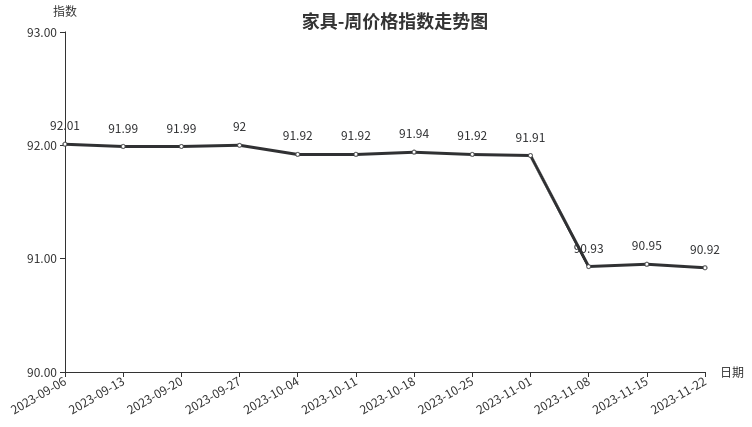 本周,家具类周价格指数收于90.92点,环比下跌0.03点,从盘面看,柜类、桌类分别下跌0.10点和0.03点,是导致家具类周价格指数下跌的主要原因;床及用品类上涨0.02点;坐具类、架类价格指数无变化。