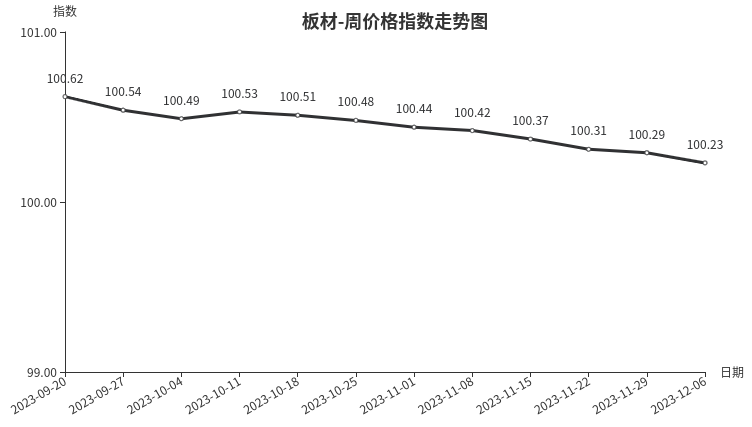 本周,板材类周价格指数收于100.23点,环比下跌0.06点,跌幅0.06%。从指数构成要素看,材料板材、周转板材周价格指数均小幅下跌,分别下跌0.07点、0.02点,跌幅分别为0.07%、0.02%。