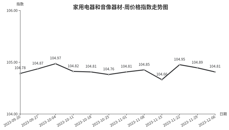 本周,家用电器和音像器材类价格指数收于104.81点,环比下跌0.08点。从二级分类看,厨房电器、净化电器、制冷电器继续下跌,分别下跌0.32、0.27、0.16点;个人生活电器继续上涨0.24点;音像器材、家居电器、热水器微涨0.02、0.01、0.01点。