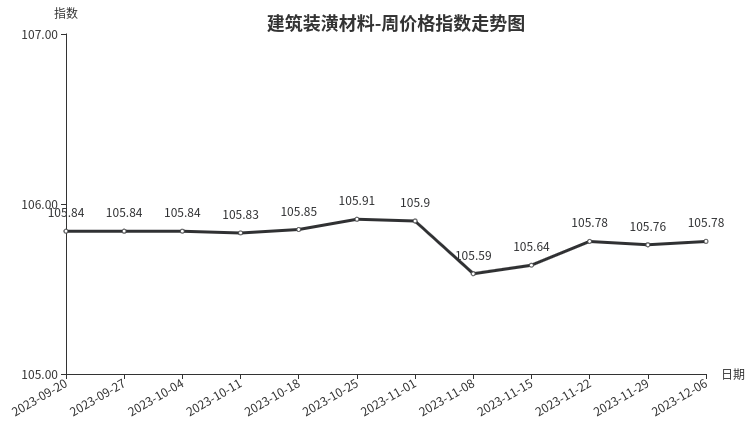 本周,建筑装潢材料类周价格指数收于105.78点,环比上涨0.02点,涨幅0.02%。从盘面看,二级分类互有涨跌,其中结构安装材料类涨幅最大,指数环比上涨0.05点,成拉动指数上涨主要因素;装饰材料类指数上涨0.02点;结构材料类指数与上周持平;专用材料类指数微跌0.02点。
