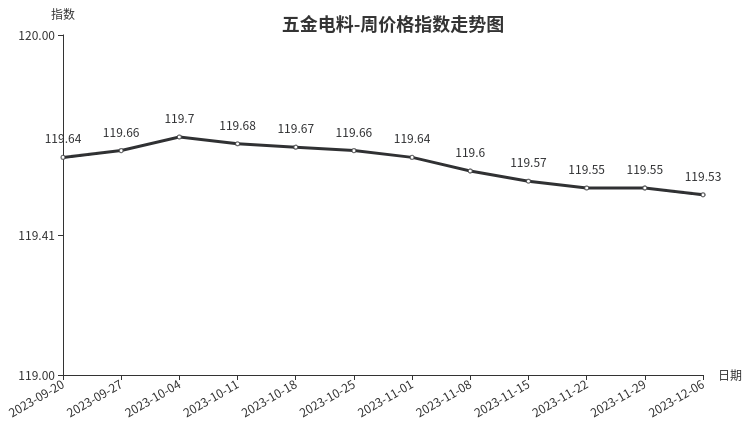 本周,五金电料类周价格指数收于119.53点,环比下跌0.02点。二级分类稳中有降,五金工具、五金零部件、建筑装饰五金类分别下跌0.02、0.01、0.01点,其他二级子类均与上周持平。