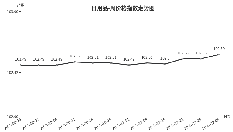 本周,日用品类周价格指数收于102.59点,环比上涨0.04点,从二级分类看,箱包类、首饰类、辅料和包装类、护理及美容用品类和玩具类分别上涨0.21、0.19、0.19、0.15、0.06点;针/纺织品类、劳动防护用品类、厨房用品类分别下跌0.06、0.02、0.01点;钟表眼镜类、卫生清洁日用品类和家居生活用品类指数与上期持平。