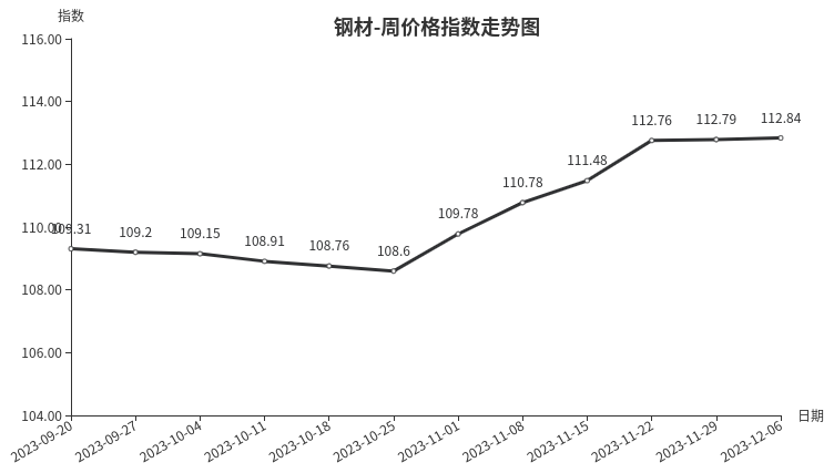 本周,钢材类周价格指数收于112.84点,环比上涨0.05点,涨幅0.04%。从盘面看,三级分类多数上涨,其中板材类、建筑钢材类、型材类指数分别上涨0.23点、0.17点和0.02点,管材类指数与上周持平。