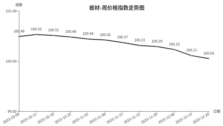 本周,板材类周价格指数收于100.05点,环比下跌0.06点,跌幅0.06%。从指数构成要素看,材料板材、周转板材周价格指数均小幅下跌,分别下跌0.07点、0.03点,跌幅分别为0.07%、0.03%。