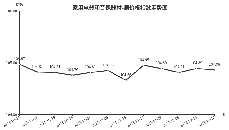 本周,家用电器和音像器材类价格指数收于104.86点,环比下跌0.03点。从二级分类看,制冷电器回落幅度较大,下跌0.31点,取暖电器、个人生活电器、家居电器、音像器材小幅下跌0.22、0.10、0.02、0.01点;厨房电器价格继续上涨0.12点,净化电器、热水器小幅上涨0.06、0.02点。