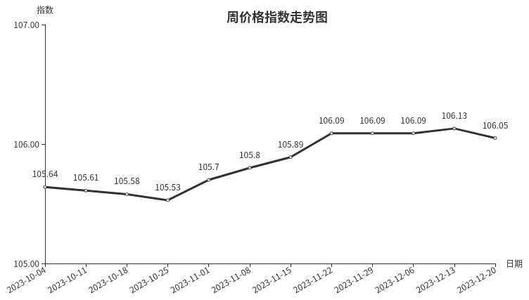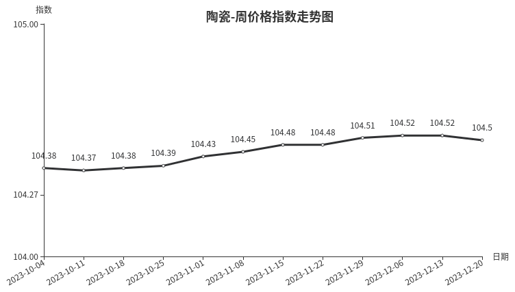 本周,陶瓷类周价格指数收于104.50点,环比下跌0.02点,跌幅0.02%。从下级分类看,陶瓷洁具、日用陶瓷周价格指数小幅下跌,分别下跌0.05点、0.01点,跌幅分别为0.05%、0.01%;建筑陶瓷周价格指数保持稳定。