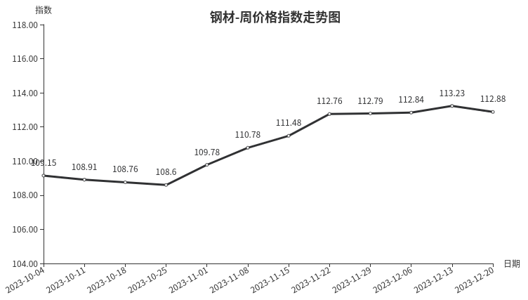 本周,钢材类周价格指数收于112.88点,环比下跌0.35点,跌幅0.31%。从盘面看,三级分类中全部出现下跌,其中建筑钢材类、型材类、管材类、板材类指数分别下跌0.37点、0.36点、0.36点和0.27点。