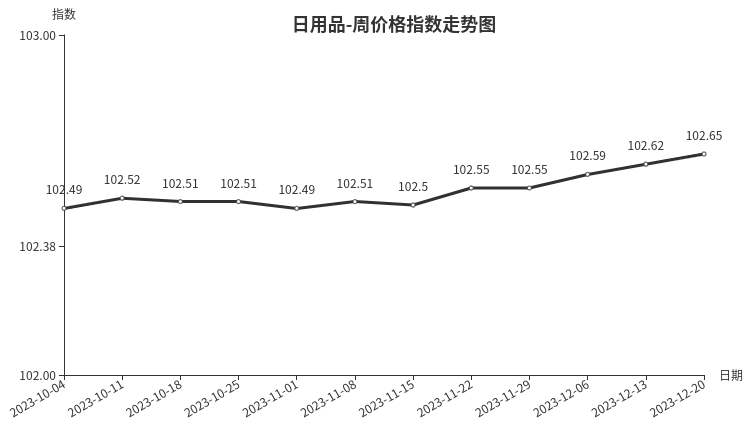本周,日用品类周价格指数收于102.65点,环比上涨0.03点。从盘面看,箱包类和护理及美容用品类涨幅最大,分别上涨0.25点和0.15点,其他分类指数涨幅较小或持平。