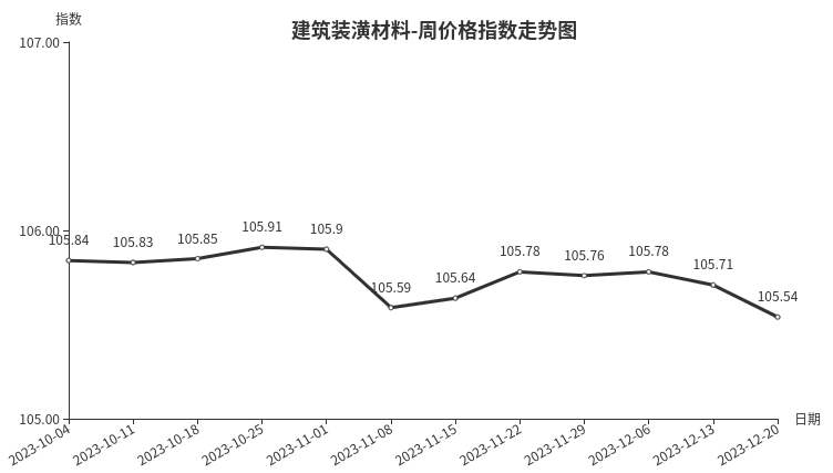 本周,建筑装潢材料类周价格指数收于105.54点,环比下跌0.17点,跌幅0.16%。从盘面看,二级分类互有涨跌,其中装饰材料类跌幅最大,指数环比下跌0.18点,拉动整体指数下行;结构材料类指数微涨0.03点;结构安装材料类、专用材料类指数与上周持平。
