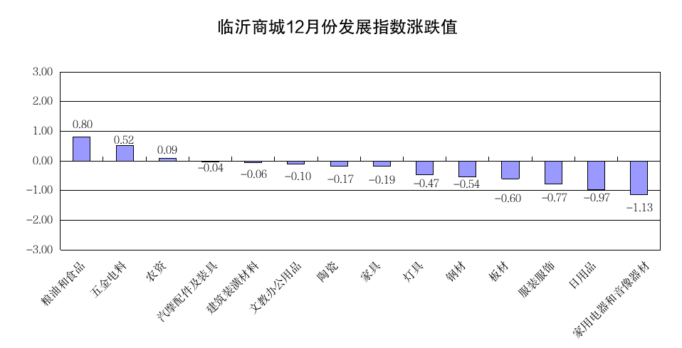 现将12月份发展指数涨跌幅较大和代表性较强的家用电器和音像器材、日用品、粮油和食品、五金电料等市场行情作简要分析。