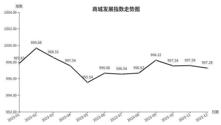 据临沂商城指数系统监测,12月份临沂商城发展指数收于997.28点,环比下跌0.30点。