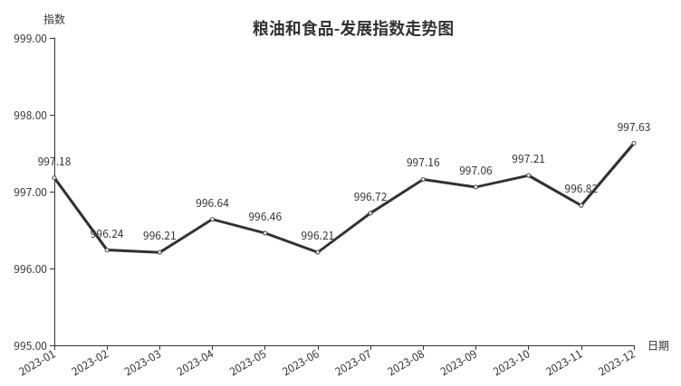 12月份,粮油和食品类发展指数收于997.63点,环比上涨0.80点。