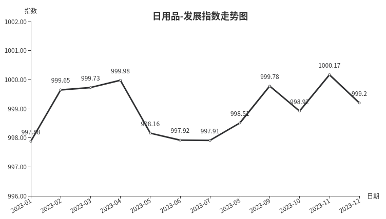 12月份,日用品类发展指数收于999.20点,环比下跌0.97点,跌幅0.10%。