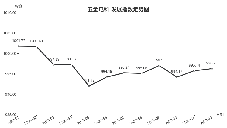 12月份,五金电料类发展指数收于996.25点,环比上涨0.52点,涨幅0.05%。其中,五金电料类发展规模指数、效益指数、信心指数分别上涨0.46、0.03、1.60点。