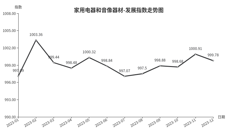 12月份,家用电器和音像器材类发展指数收于999.78点,环比下跌1.13点。其中,发展规模指数、发展效益指数、发展信心指数全部下跌,指数分别下跌1.50点、1.31点和0.01点。