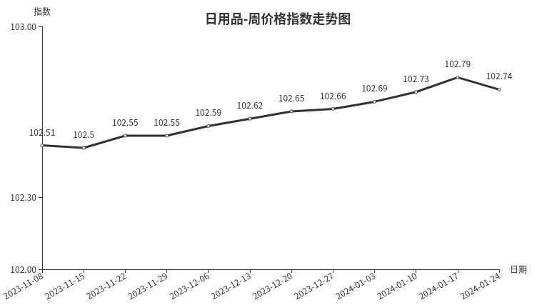 本周,日用品类周价格指数收于102.74点,环比下跌0.05点,从二级分类看,跌幅较大的有箱包、家居生活用品、厨房用品和首饰类,分别下跌0.26点、0.23点、0.16点和0.15点,其它分类价格指数变化不大。
