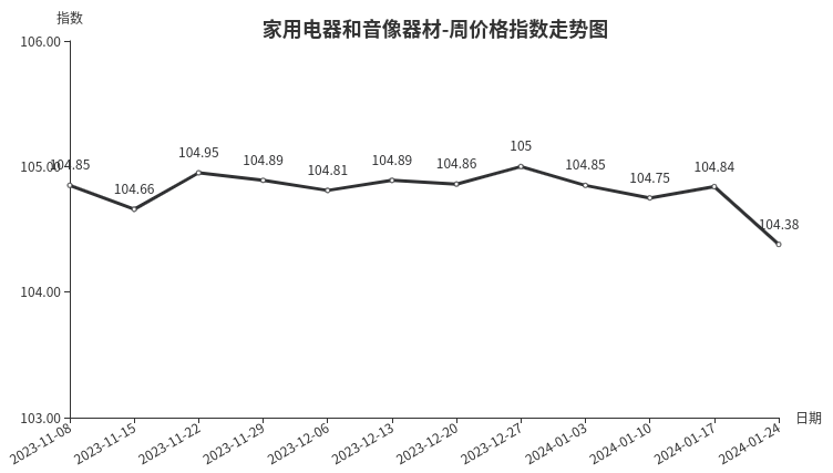 本周,家用电器和音像器材类价格指数收于104.38点,环比下跌0.46点。从二级分类看,厨房电器、净化电器价格回落,分别下跌1.74、0.57点,热水器价格继续下跌0.07点;音像器材、制冷电器、个人生活电器、家居电器价格分别上涨0.26、0.19、0.17、0.05点。