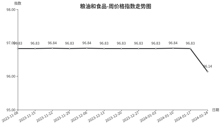 本周,粮油和食品类周价格指数收于96.14点,环比下跌0.69点,跌幅0.71%。从盘面看,粮油类跌幅最大,下跌0.88点;调味品、干果、副食、茶叶类跌幅较小,分别下跌0.11、0.04、0.03和0.03点。