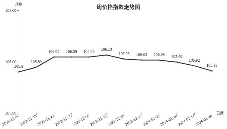 据临沂商城价格指数信息系统监测,本周临沂商城周价格总指数为105.82点,环比下跌0.10点。