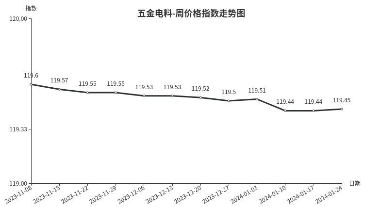 本周,五金电料类周价格指数收于119.45点,环比上涨0.01点。从盘面看,二级分类中五金工具类、仪器仪表类分别上涨0.02、0.03点,其他类价格整体与上周持平。