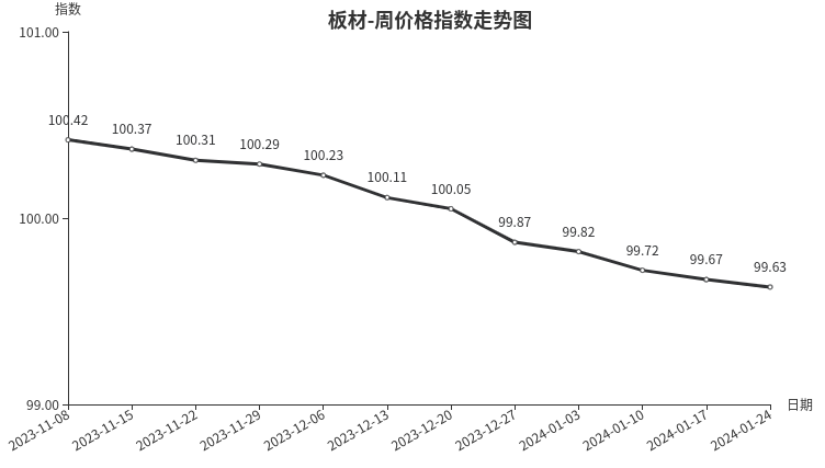 本周,板材类周价格指数收于99.63点,环比下跌0.04点,跌幅0.04%。从指数构成要素看,材料板材周价格指数小幅下跌0.05点,跌幅0.05%;周转板材周价格指数环比持平。