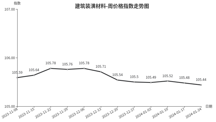 本周,建筑装潢材料类周价格指数收于105.44点,环比下跌0.04点,跌幅0.04%。从盘面看,二级分类互有涨跌,其中装饰材料类、结构安装材料类环比下跌,指数均下跌0.04点,成拉动指数下跌主要因素;结构材料类、专用材料类指数分别上涨0.02点和0.03点。