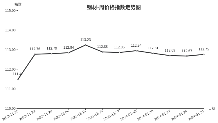 本周,钢材类周价格指数收于112.75点,环比上涨0.08点,涨幅0.07%。从盘面看,三级分类全部上涨,其中型材类、板材类涨幅明显,指数环比上涨0.30点和0.16点,成拉动指数上涨主力;建筑钢材类、管材类指数均上涨0.01点。
