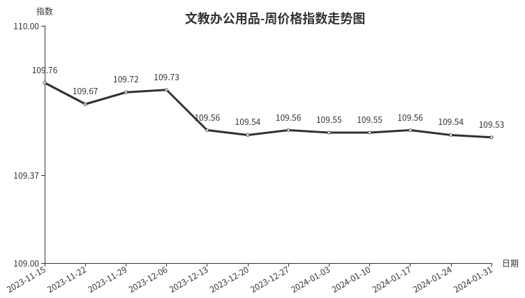 本周,文教办公用品类周价格指数收于109.53点,环比下跌0.01点,跌幅0.01%。从盘面看,二级分类中文化办公用品、体育娱乐用品均有所下跌,分别下跌0.02、0.01点。