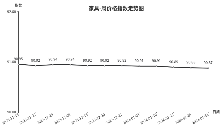 本周,家具类周价格指数收于90.87点,环比下跌0.01点,跌幅0.01%。从盘面看,二级分类中,坐具类、床及用品类、桌类指数出现下跌,指数分别下跌0.02点、0.01点和0.01点;柜类、架类指数与上周持平。