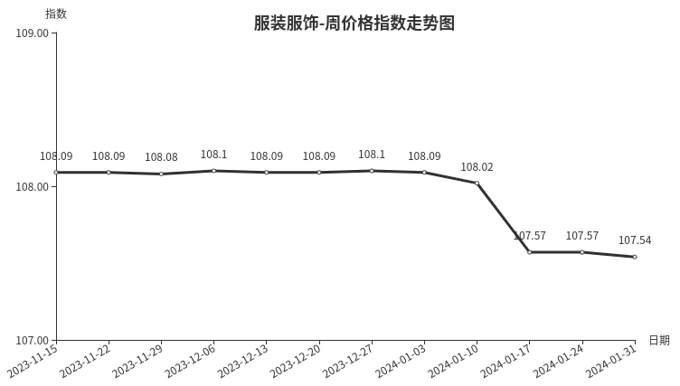 本周,服装服饰类周价格指数收于107.54点,环比下跌0.03点。从二级分类看,主要是服饰类下跌,其中腰带类、鞋类分别下跌0.83点和0.03点,是导致服装服饰类周价格指数下跌的主要原因。