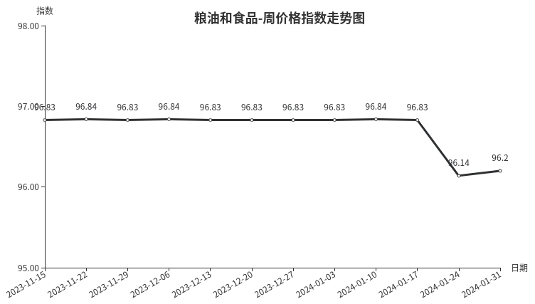 本周,粮油和食品类周价格指数收于96.20点,环比上涨0.06点,涨幅0.06%。从盘面看,只有粮油类和干果类是上涨的,分别上涨0.09点和0.04点;茶叶类、副食类、调味品类均出现下跌,分别下跌0.09点、0.05点、和0.02点。