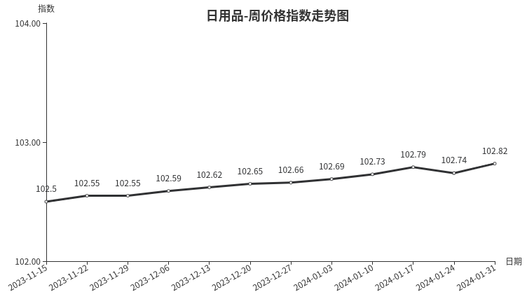 本周,日用品类周价格指数收于102.82点,环比上涨0.08点,涨幅0.08%。从二级分类看,针纺织品、箱包、首饰、玩具周价格指数涨幅较为突出,分别上涨0.49%、0.39%、0.1%、0.07%;护理及美容用品、工艺品周价格指数小幅下跌,分别跌幅0.21%、0.05%。