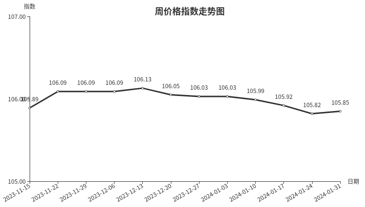 随着春节临近,日用品类产品市场需求释放,市场客流量增加,拉杆箱、女包、沙发坐垫、地垫等产品销量环比上涨。市场即将休市放假,中下游经销商积极备货,交易量环比上涨,价格小幅走高,带动本周日用品类周价格指数小幅上行。从具体规格品看,傲宇E32-26拉杆箱本周价格为620.00元/个,价格环比上涨3.95%;瑞牌S6311书包本周均价为230.00元/个,价格环比上涨3.87%;海门市天朴海玲绣品厂90*90cm*10沙发座垫本周均价为33.00元/套,价格环比上涨2.93%。