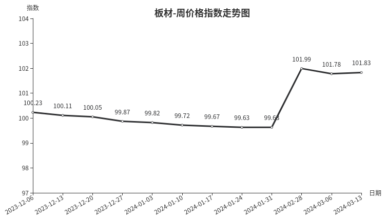 本周,板材类周价格指数收于101.83点,环比上涨0.05点,涨幅0.05%。从二级分类看,周转板材、材料板材周价格指数均小幅上涨,分别上涨0.13点、0.03点,涨幅分别为0.12%、0.03%。
