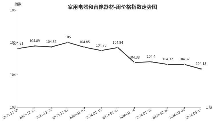 本周,家用电器和音像器材类周价格指数收于104.18点,环比下跌0.14点。从二级分类看,制冷电器、净化电器、厨房电器、音像器材分别下跌0.54、0.33、0.21、0.12点;热水器、个人生活电器分别上涨0.07、0.01点。