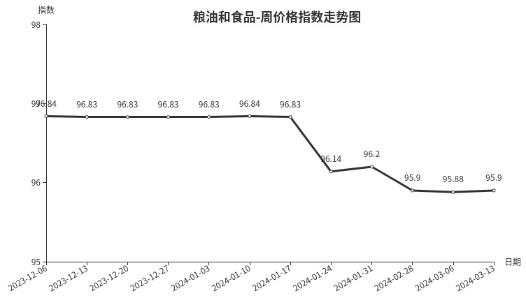 本周,粮油和食品类周价格指数收于95.90点,环比上涨0.02点。从盘面看,调味品、干果、副食、茶叶类均出现上涨,分别上涨0.23、0.16、0.05、0.04点,粮油类价格指数与上期持平。