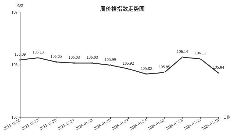 据临沂商城价格指数信息系统监测,本周临沂商城周价格总指数为105.84点,环比下跌0.27点,跌幅0.26%。