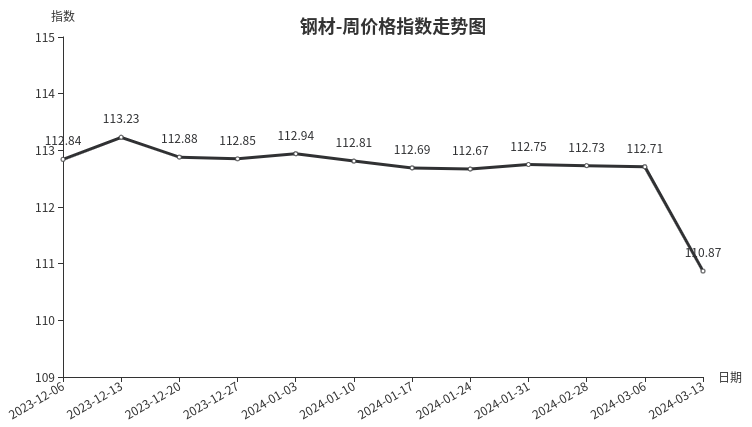 本周,钢材类周价格指数收于110.87点,环比下跌1.84点,跌幅1.63%。从盘面看,三级分类全部出现下跌,其中建筑钢材类、型材类、板材类、管材类指数分别下跌2.57点、2.43点、2.24点和1.38点。