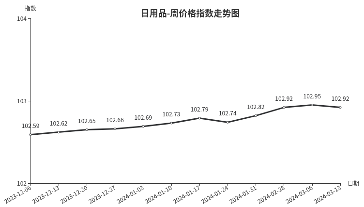 本周,日用品类周价格指数收于102.92点,环比下跌0.03点,跌幅0.03%。从二级分类看,针纺织品、护理及美容用品、首饰、工艺品周价格指数小幅下跌,分别下跌0.19%、0.15%、0.08%、0.03%;箱包、玩具周价格指数小幅上涨,涨幅分别为0.32%、0.04%。