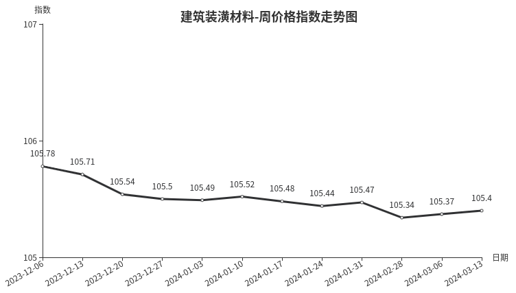 本周,建筑装潢材料类周价格指数收于105.40点,环比上涨0.03点,涨幅0.03%。从盘面看,二级分类多数上涨,其中结构安装材料类、专用材料类、装饰材料类指数均出现上涨,指数分别上涨0.11点、0.03点和0.02点;结构材料类指数与上周持平。