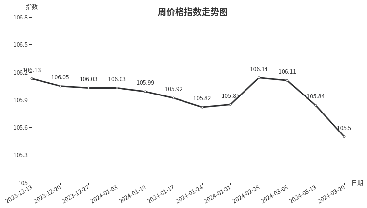据临沂商城价格指数信息系统监测,本周临沂商城周价格总指数为105.50点,环比下跌0.34点,跌幅0.33%。