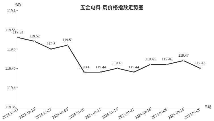 本周,五金电料类周价格指数收于119.45点,环比下跌0.02点。从二级分类看,建筑装饰五金、五金工具、电工电器类周价格指数小幅下跌,分别下跌0.03、0.02、0.02点;电线电缆周价格指数小幅上涨0.02点。