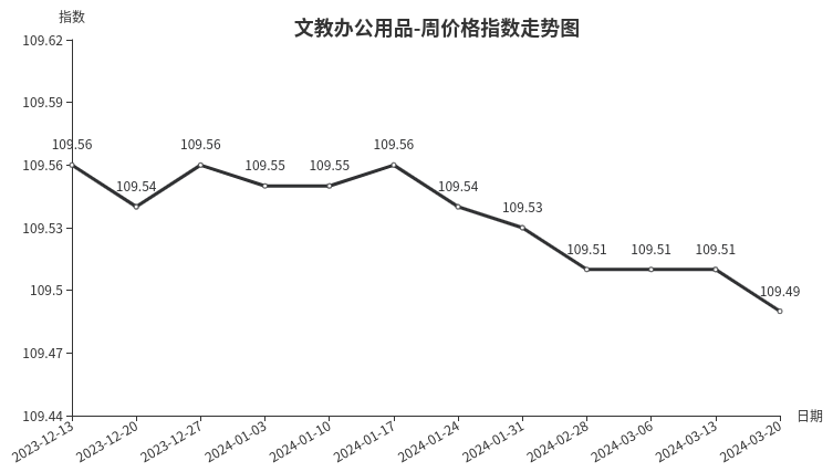 本周,文教办公用品类周价格指数收于109.49点,环比下跌0.02点,其中,文化办公用品类下跌0.04点,体育娱乐用品类价格指数与上期持平。