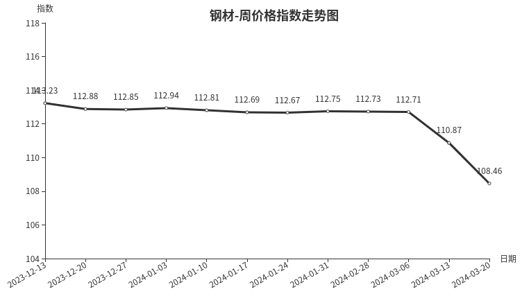 本周,钢材类周价格指数收于108.46点,环比下跌2.41点,跌幅2.17%。从盘面看,三级分类全部出现下跌,其中建筑钢材类、型材类、板材类、管材类指数分别下跌3.38点、3.16点、2.67点和1.88点。