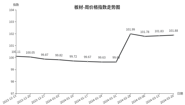 本周,板材类周价格指数收于101.88点,环比上涨0.05点,涨幅0.05%。从指数构成要素看,二级分类中材料板材周价格指数环比上涨0.06点,涨幅0.06%;周转板材周价格指数环比持平。