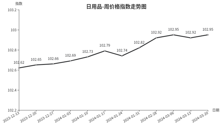 本周,日用品类周价格指数收于102.95点,环比上涨0.03点,涨幅0.03%。从二级分类看,首饰、玩具、工艺品、箱包、护理及美容用品周价格指数均出现小幅上涨,分别上涨0.17%、0.09%、0.06%、0.03%、0.03%。