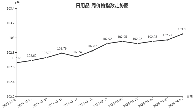 本周,日用品类周价格指数收于103.05点,环比上涨0.08点,从二级分类看,护理及美容用品、首饰、工艺品、玩具、辅料和包装类分别上涨0.42、0.34、0.32、0.08、0.04点;针/纺织品、箱包、劳动防护用品类指数均出现下跌,厨房用品、卫生清洁日用品、钟表眼镜、家居生活用品类指数与上期持平。