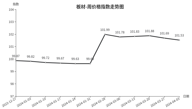 本周,板材类周价格指数收于101.53点,环比下跌0.16点,跌幅0.16%。从指数构成要素看,材料板材周价格指数环比下跌0.19点,跌幅0.19%,成为拉动本周板材类周价格指数下行的主导因素;周转板材周价格指数环比持平。