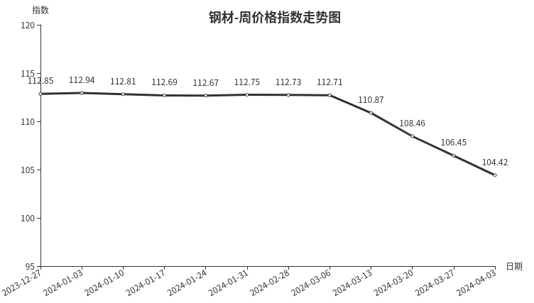 本周,钢材类周价格指数收于104.42点,环比下跌2.03点,跌幅1.91%。从盘面看,三级分类全部出现下跌,其中型材类、建筑钢材类、板材类、管材类指数分别下跌2.87点、2.61点、2.10点和1.61点。