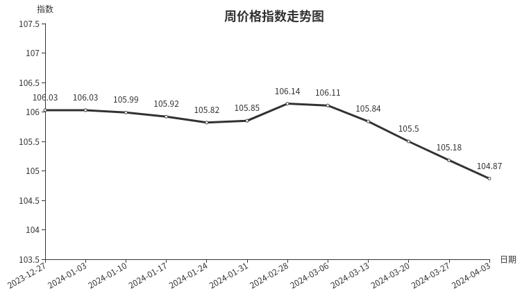 据临沂商城价格指数信息系统监测,本周临沂商城周价格总指数为104.87点,环比下跌0.31点,跌幅0.30%。